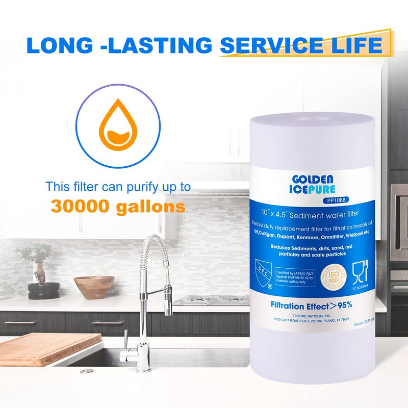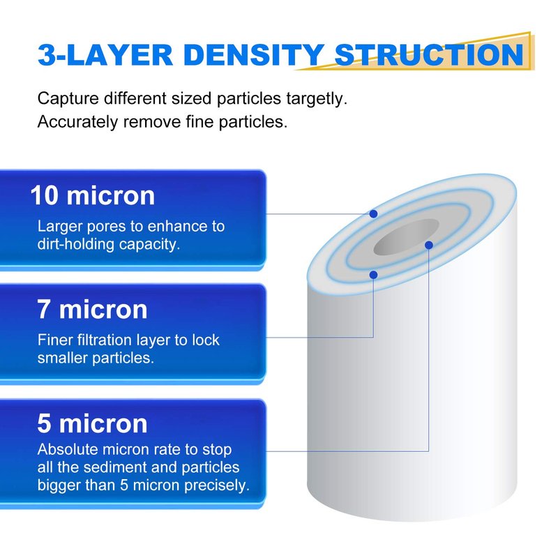 - 【HIGH QUALITY FILTRATION】Triple-layer density structure. The 5 microns inner layer captures small particles. The outer layer is 10 micron to hold more dirt. BPA Free, Lead-Free substances contained in the filter. Golden Icepure only uses healthy materials. Select the certified filters and materials guaranteed only.