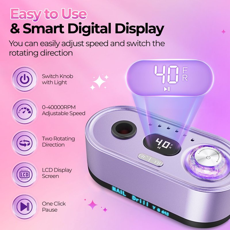 Professional electric nail drill machine meets all your needs for removing acrylic polish, gel polish, manicuring and shaping nails in your daily manicure work, with an adjustable knob up to 40000 rpm and a smart high-definition LCD display, Suitable for beginners and professionals, it is the ideal gift for your family and friends!