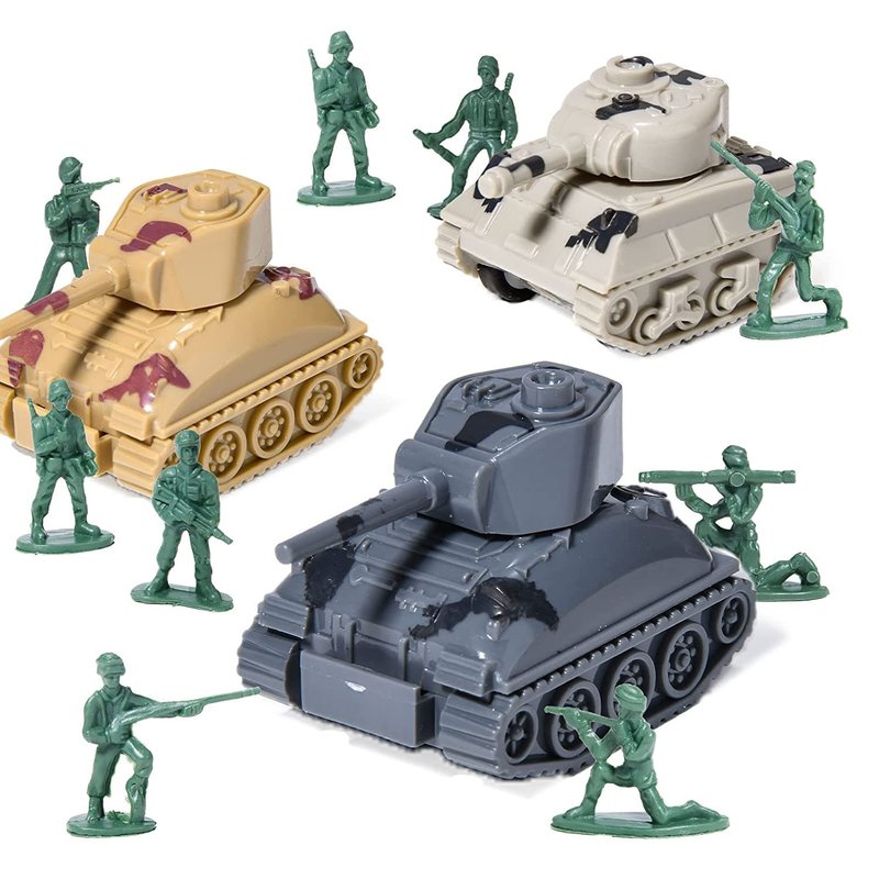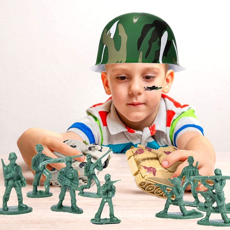 - COMPLETE ARMY CAMOUFLAGE PARTY FAVORS:This army party decorations include 12 camo goodie bags(4 styles), 6 camo parachute toys (2 styles ''run'' ''jump''), 12 mini army men toy soldiers figures, 12 Silicone Bracelets(2 styles), 16 tattoo stickers, 6 mini army men toy tank(4 styles), 12 airplane keychain for kids(6 styles). Suitable for multiple kids to have fun playing together, and also for you to spend happy family time with your kids