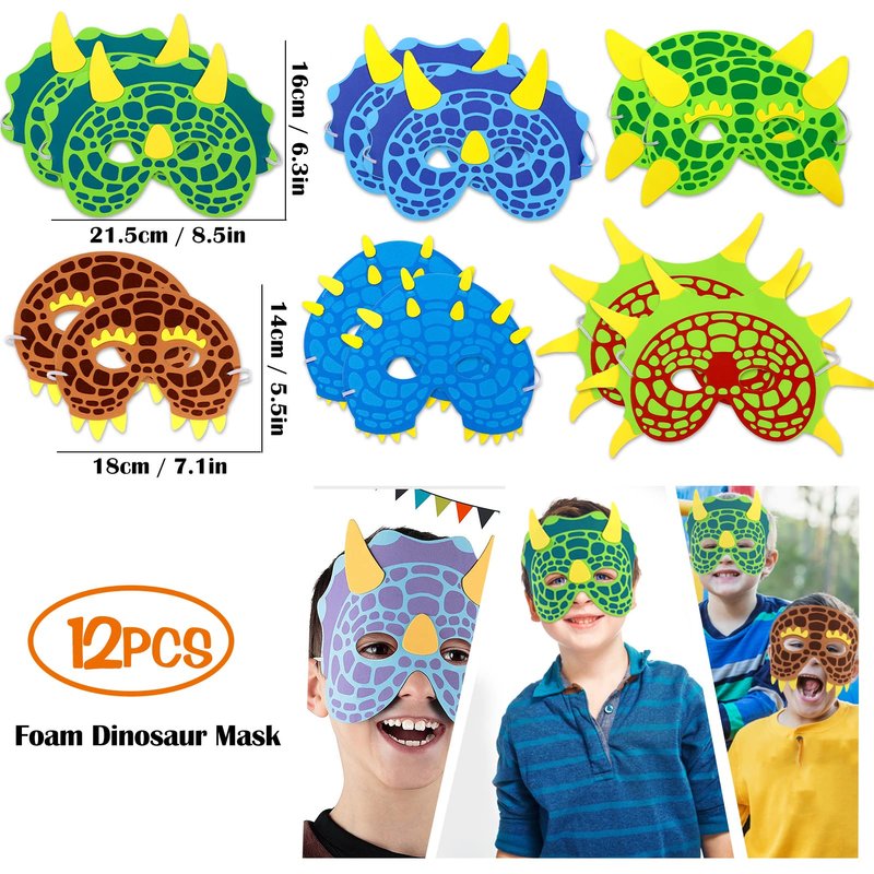 - SAFETY MATERIAL: These dino party favors are made of non-toxic material and will not irritate skin or hazardous to health. Dinosaur mask is made of soft foam and cute design size for kids. Dinosaur stampers are made of high-quality plastic, solid quality. Dinosaur gift bag is made of high quality composite material with beautiful pattern, perfect for dino give away gift