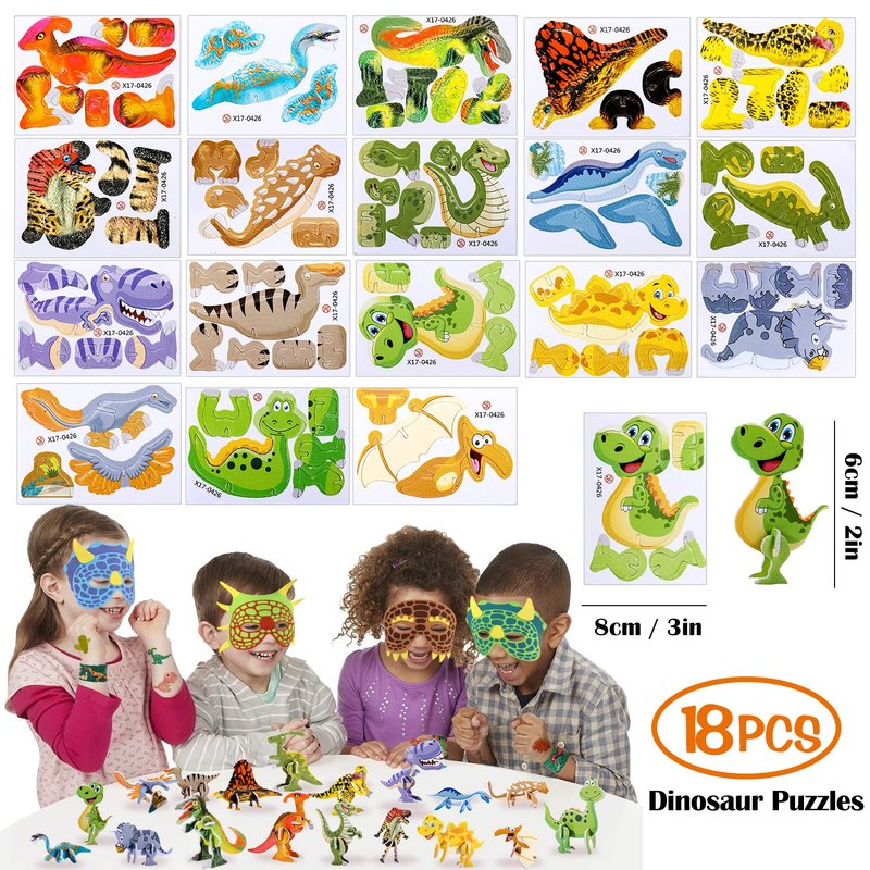 - DINOSAUR PARTY FAVORS SET: Package includes 102pcs, serve for 12 kids. It comes with 12 dinosaur eggs(6 colors), 18 dino model puzzle (random style), 12 dinosaur stampers(10 styles), 12 foam dino masks(6 styles), 12 dinosaur slap bracelets(12 styles), 12 sheet dinosaur tattoo stickers(12 styles), 12 keychains(12 styles), 12 dino gift bags(4 styles). Great dino party favors for kids birthday party