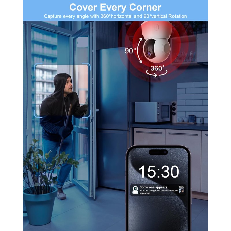 - 【Built-in Siren&Instant Alert for Home Security】--The security camera for home with motion tracking is built with a siren that can be controlled remotely. In case of any suspicious activity, it can be triggered to deter intruders. Instant alerts will also be sent to your phone, keeping you informed and allowing you to take immediate action. Especially suitable for those who are often away from home.