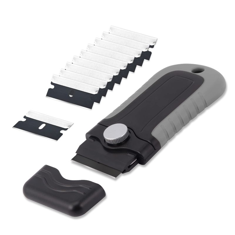- Include 1pcs plastic razor scraper and 10pcs black carbon steel blades.The plastic cooktop scraper tool kit can work for hard and soft surface without scratches, meet your various needs
