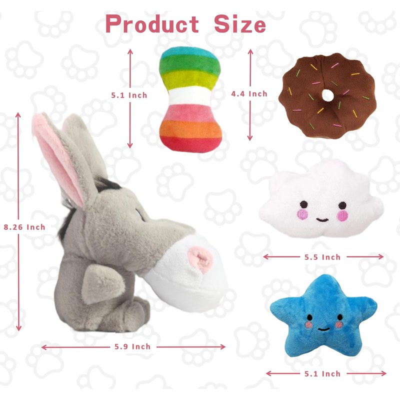 - 【Luxury Puppy Toys Set】 There are 5 pack, including one lovely donkey squeaky plush toys and various small toys. Great size for small and medium puppy, and the best gift for your furry friend.