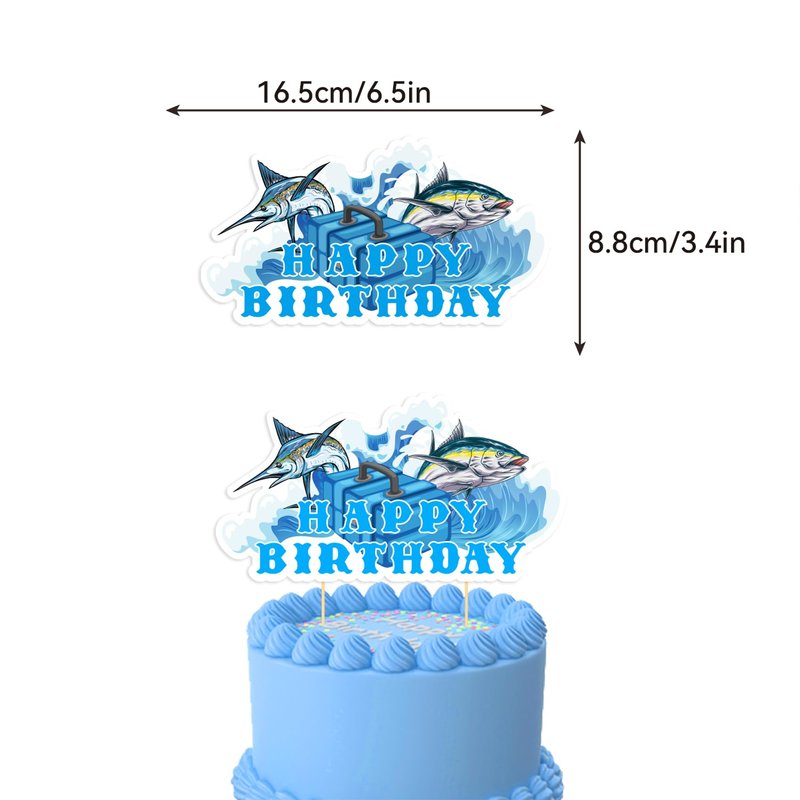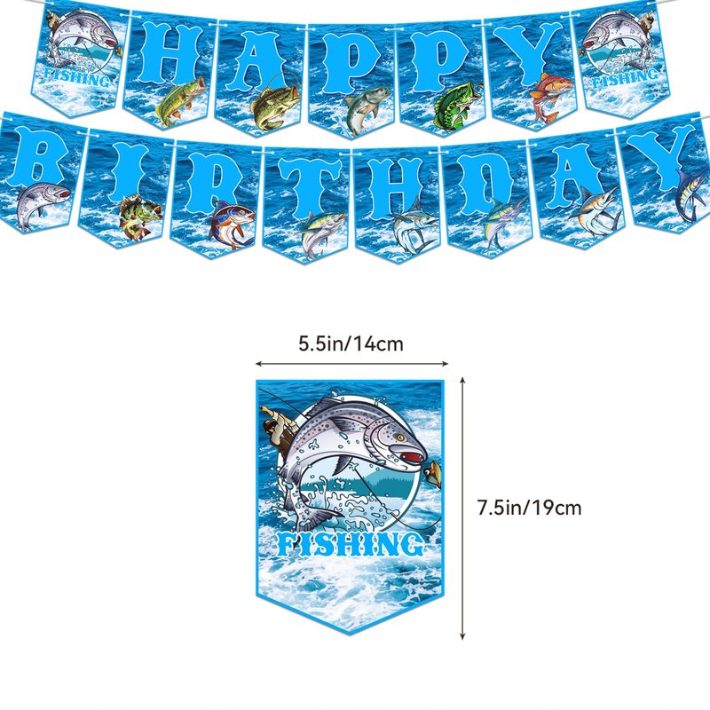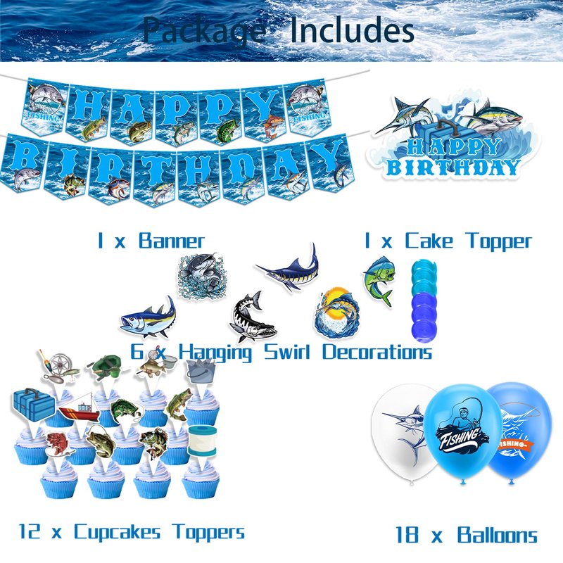 - Gone Fishing Party Supplies: Package includes 1 * Fishing happy birthday banner, 1* fishing happy birthday cake topper, 6* fishing hanging swirls, 12 * fishing cupcake toppers, 18* fishing balloons, 1 * ribbon. Perfect decoration for gone fishing themed parties.