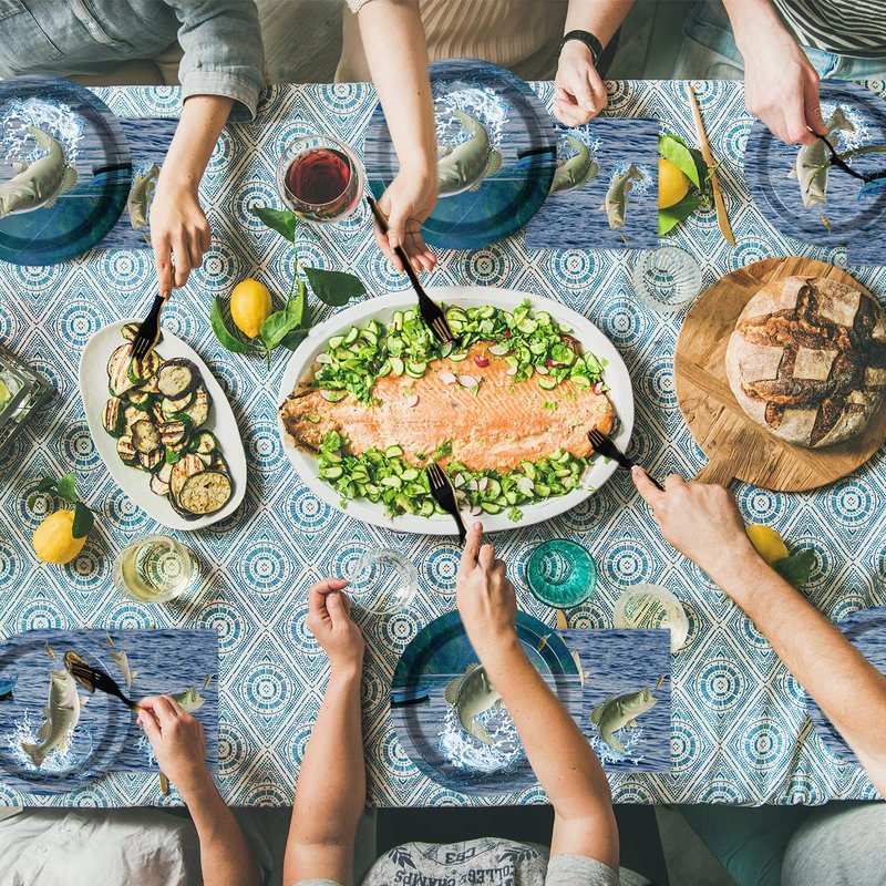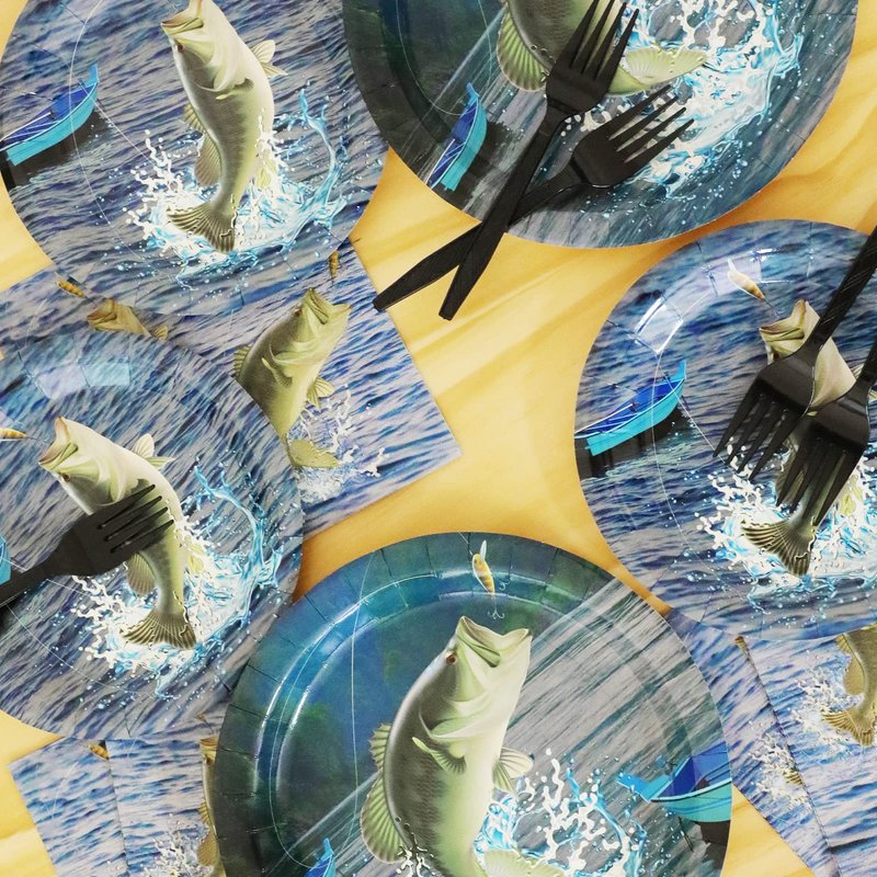 - 【Gone Fishing Party Supplies Serves 24】 This fishing themed party supplies set includes: 24 plates (9inch) + 24 plates (7inch) + 24 napkins (13inch) + 24 forks, there are a total of 96 pieces in this set, which will add fun to fishing themed party