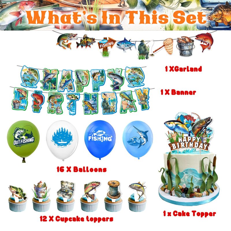 - Gone Fishing Party Supplies Set: This Set Includes Everything You Need For A Fishing-Themed Party, Includes 1 Set Happy Birthday Banner, 1Set Paper Garlands, 1 Piece Cake Topper, 12 Pieces Cupcake Toppers, 16 Pieces Balloons, 1 Piece Balloon Ribbon, Which Are Sufficient To Meet Your Various Decorative Demands, And You Can Share Them With Your Good Friends.