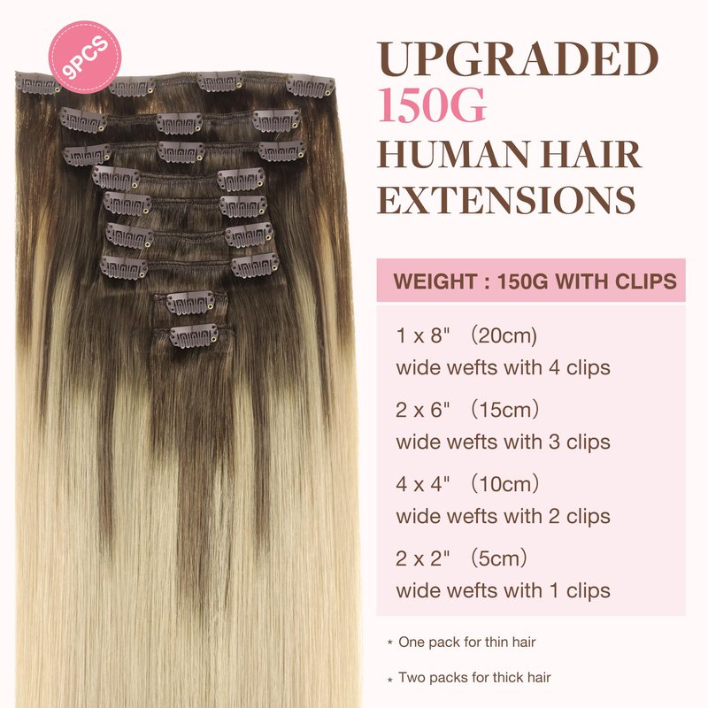 - Clip In Hair Extensions Specification: GOO GOO seamless clip-in hair extensions with PU are available in 110g, 130g, 151g, 160g; clip-in extensions are offered in weights of 120g and 150g for selection. Perfect for a natural thickness boost with 1-2 sets, or achieve a full, voluminous look with 2-3 sets. Ideal for adding both length and volume. Plus, 2 additional replacement clips for your convenience.