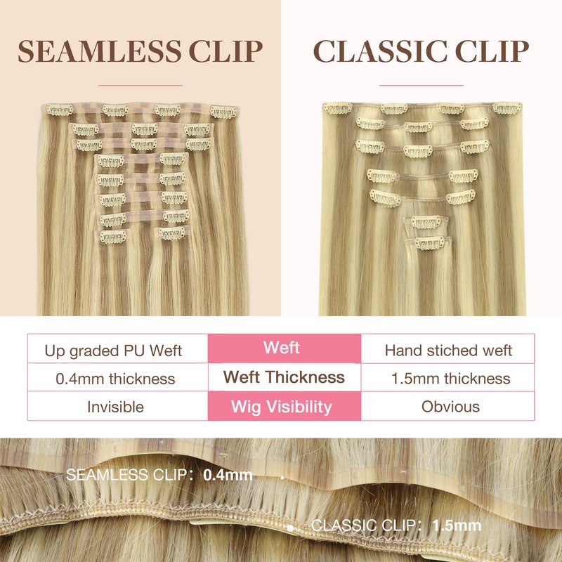 - High-Quality Clips for Quick Wear: Our clip in extensions boast slim, silicone-backed clips for a barely-there feel, securely stitched and cushioned with gentle rubber to safeguard your scalp and hair. The PU design makes the seamless clip in hair extensions more invisible, comfortable, natural, and lighter. They're a breeze to self-apply and remove, perfect for effortlessly transforming your look for any event, from weddings to parties to date nights.