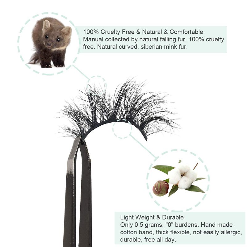 - 4.【Only 0.5g - Light Weight】-- Each pair of mink eyelashes only weigh 0.5 grams. Lightweight "0" burdens. Cruelty-free Mink fur. These fine fibers come from the tails of artificial breeding minks' natural falling hair and are sanitized and dyed before they're packaged as easy-to-install eyelashes.