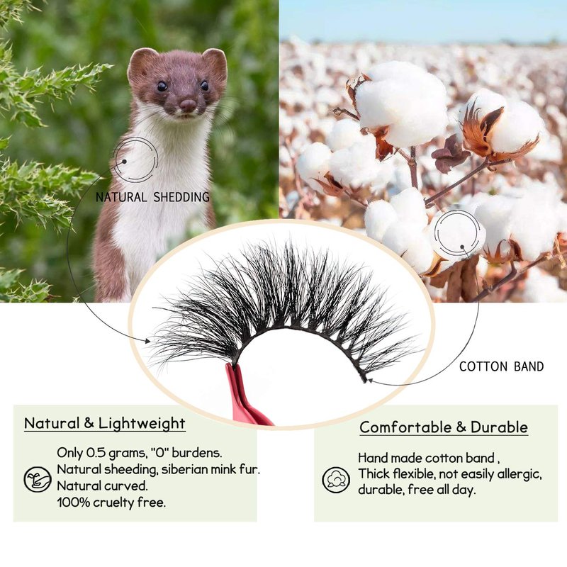 - 4.【Only 0.5g - Light Weight】 -- Each pair of our 3D mink false eyelashes only weighs 0.5 grams. Lightweight "0" burdens, no heavy feeling. You will not even feel their exist on your eyes. Cruelty-free Mink fur. These fine fibers come from the tails of artificial breeding minks' natural falling fur and are sanitized and dyed before they're packaged as easy-to-install eyelashes.