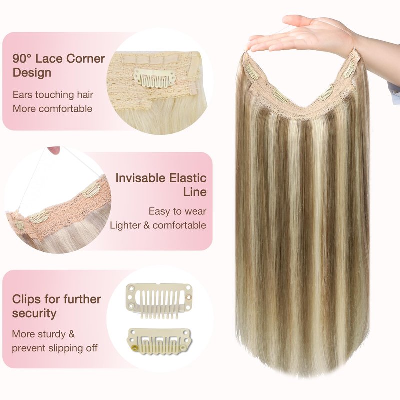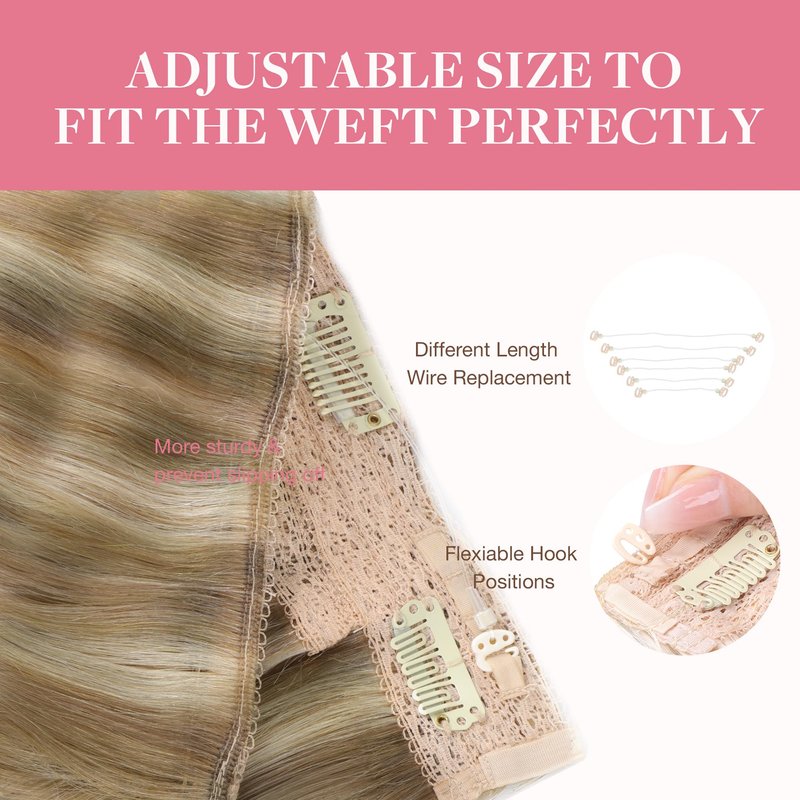 Our Wire Hair Extensions Advantage:1. Instant Length and Volume: Only 5 minutes to put or take out. Wire hair extensions are the easiest and quickest way of adding volume and length ever. Don’t need to worry if you are new to hair extensions.2. Super Convenient: Just put the hair extensions on your head, and pull your hair over the miracle wire to cover the hair extensions. Comb the hair to make it blend with your hair. Then you are ready for a date.3. More Natural & healthy: no tape, no glue, better hair protection. 100% remy human hair extensions can be dyed, curled or straightened.4. More invisible: with transparent wire, can blend perfectly with your hair color.5. Adjustable Size: by adjusting the position of the hook and then you can tighten or loosen the standby wire whose length is 9.25 inch. We put 3 more wires in the package. It’s not suitable for people with very fine hair on the top or baldness as the wire may be seen.Our Wire Human Hair Extensions Specification:Hair Material: Remy human hair can be curled and dyed.Transparent Wire Hair Extensions: one piece per pack.Texture: Straight, and have a natural wave when wet or left to airdry or diffused.Size: Adjustable. Fit the extensions on your head by tightening or loosening the wire.Length: 12inch,14inch 16inch, 18inch, 20inch.Width: 10.9inch.Light Weight: 12": 70g, 14": 75g, 16"-18": 95g, 20": 110g. 1 pack is for adding length, and 2 packs are for adding volume.