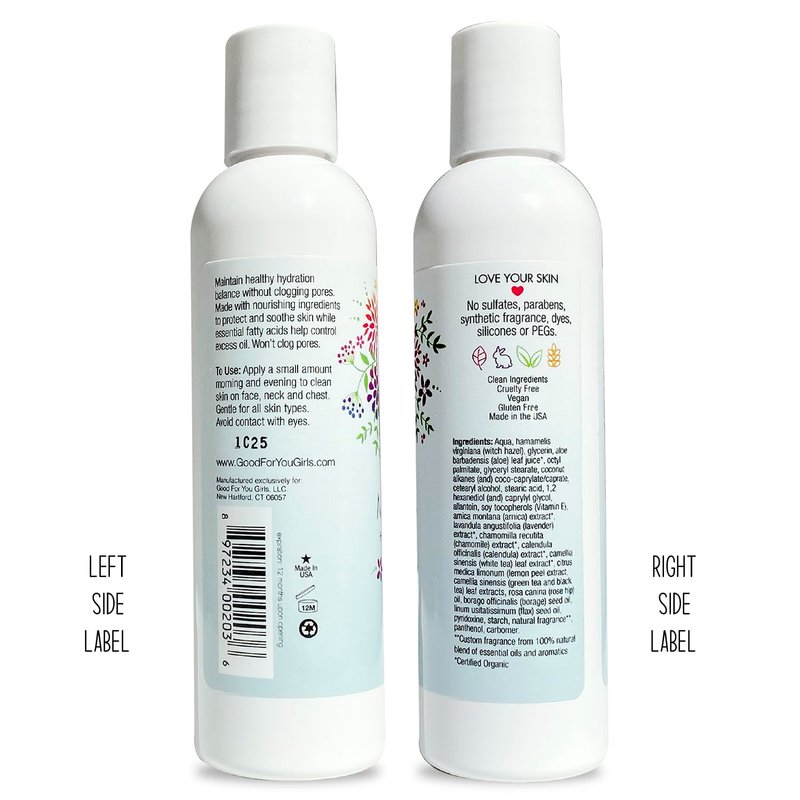 Good For You Girls lightweight facial moisturizer is specifically formulated to maintain a healthy moisture balance without clogging pores. Contains nourishing vitamins, antioxidants, and essential fatty acids of flax, borage and rose hip oils that help feed and nourish your skin. These special ingredients also help to thin out and control excess oil production. Organic botanicals like chamomile, aloe, and calendula help to soothe skin, reduce redness and irritation. Good For You Girls Moisturizer is also vegan and gluten-free. None of our products contain sulfates, phthalates, synthetic fragrance, or dyes. The gentle and hypoallergenic formula is safe and suitable for all skin types. TO USE: Apply a small amount of moisturizer morning and evening to clean the skin on the face and neck.