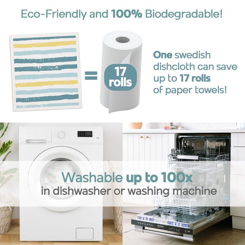 Reusable & Durable - Replace up to 17 rolls of paper towels with one Swedish dishcloth! This reusable Swedish dishcloth is so durable you can use it over 100 times before it's time for a new one. Rinse it off in the sink with some hot water and a drop of soap, or toss your Swedish dish clothes in the washing machine or even the dishwasher. Good as new! These Swedish dishcloths come in a pack of 6.