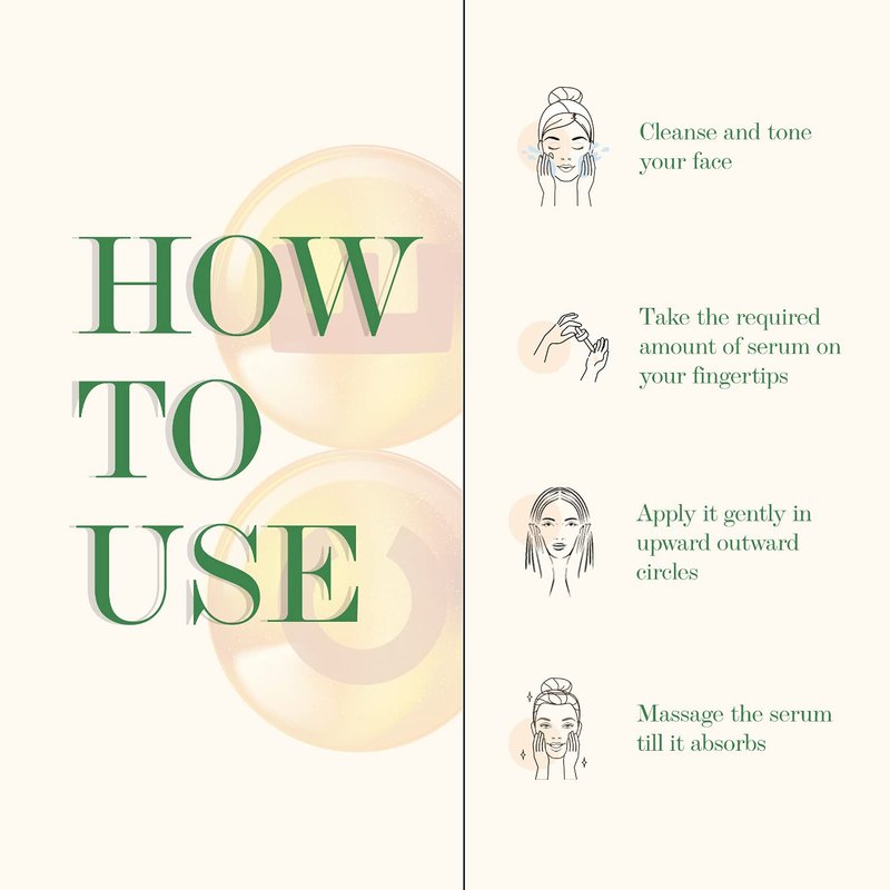 - HOW TO USE: Use the serum as a part of your day & night routine, after cleansing & toning your face. Add few drops on your face. Gently massage it with your finger tips in circular motions. Leave it on to let your skin absorb it.