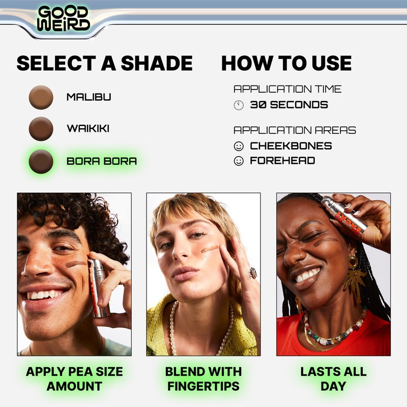 - Makeup for Everyone: Good Weird Back from Vacay Bronzer - Bora Bora (Dark Bronze) is a perfect makeup accessory for all skin types and identities. The sheer, gel-cream formula is easy to apply and helps everyone explore the beauty aisle without any boundaries. Subtle shimmer to increase glow.