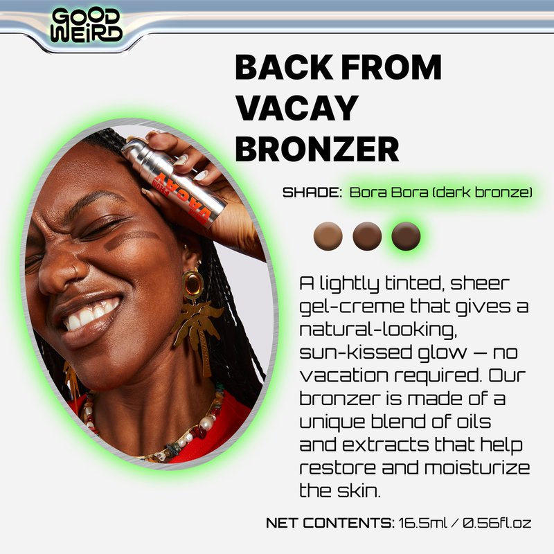 - Versatile: Use it as a highlighter makeup to accentuate your features or as a liquid bronzer for overall warmth. With the Back from Vacay Bronzer, you control the level of glow. Get ready to look good, feel better, and stay weird with Good Weird.