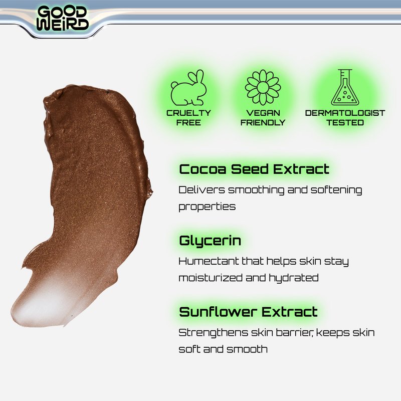 Good Weird Back from Vacay Bronzer - Bora Bora (Dark Bronze) is a versatile makeup accessory designed to suit all skin types and identities. This sheer, gel-cream bronzer offers a natural, sun-kissed glow mimicking the perfect vacation effect. Infused with Cocoa Seed Extract, Glycerin, and Sunflower Extract, it nourishes your skin while enhancing your complexion. The easy application process allows you to blend the bronzer into your skin effortlessly, providing a warm, glowing finish that's as versatile as it is buildable. Ideal as a highlighter or a liquid bronzer, it lets you control the level of glow. With Good Weird, everyone can look good, feel better, and stay weird.