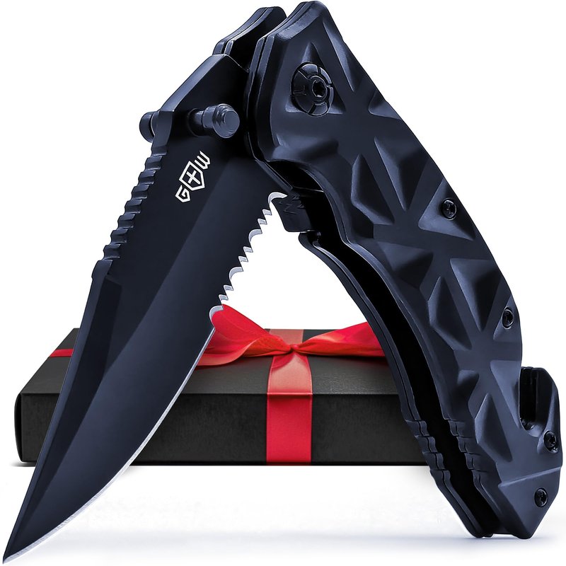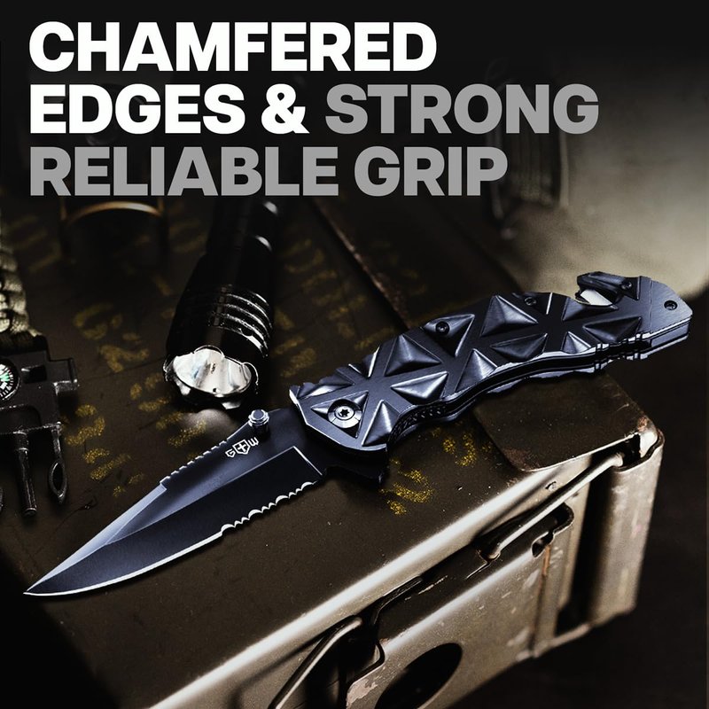 GOOD WORKER Black Pocket Knife - Serrated Sharp 3.5" Blade - Spring Assisted Tactical Knife with Wire Cutter Glass Breaker - Cool Folding Knives for Camping Hunting - Gift for Men & Women HB 207