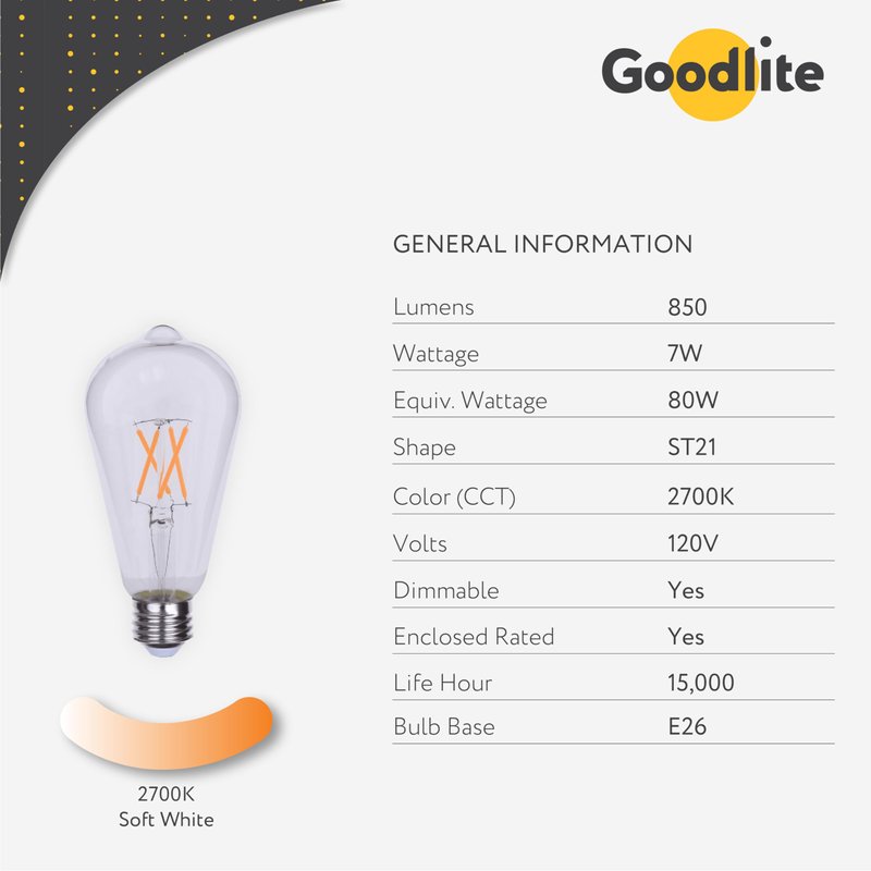 Goodlite G-83474 ST21 Clear LED Light Bulb, 7W= 80-Watt Equivalent 850 lumens Warm White 2700k E26 Base Dimmable