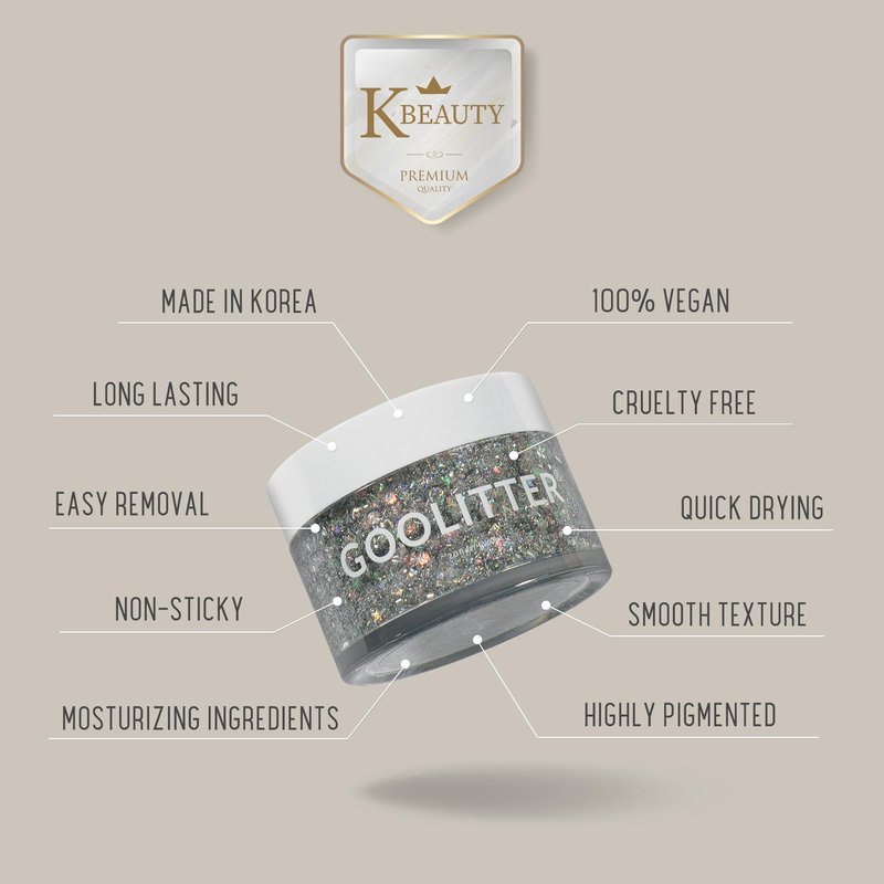 Goolitter holographic body gel bring you the highest quality, ethically sourced premium glitter gel available anywhere in the know universe. Our holographic glitter gel is perfect for Halloween party, rave, edm festivals, concerts, cosplay costume. Goolitter is a perfect goto makeup gel for hair, face and body. It is made with vegan, cruelty free, cruelty-free, latex free, latex-free, and nontoxic non-toxic ingredients in our GMP certified manufacturing facility in South Korea. Our Goolitter Gel is highly pigmented with cosmetic grade glitter thereby allowing a small amount of Goolitter to spread the bling over large surface. Holographic, Chroma, Chameleon, Shape glitter, fine, Chunky, Holographic, Body, Face, Hair Glitter, Gel, Safe, Chameleon, K-Beauty, Korean cosmetics, mirror, crushed, glitters, festival, edm, rave, Halloween, concert, chorme, mermaid, sequin, accessories, unicorn, meicoly, glow in the dark
