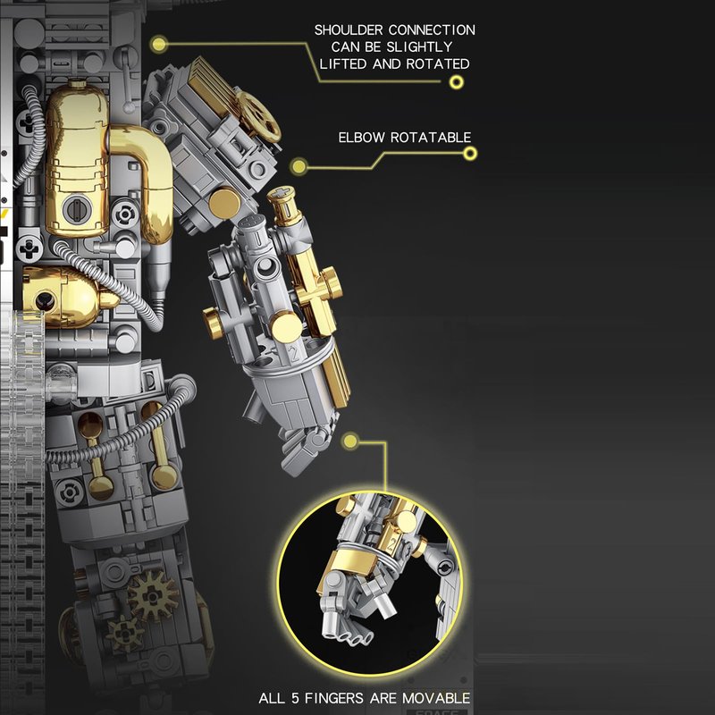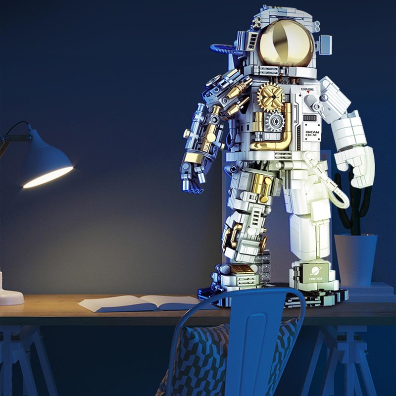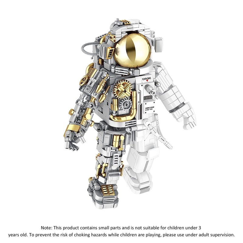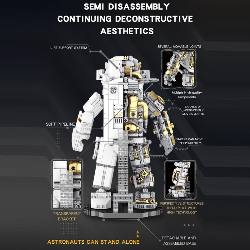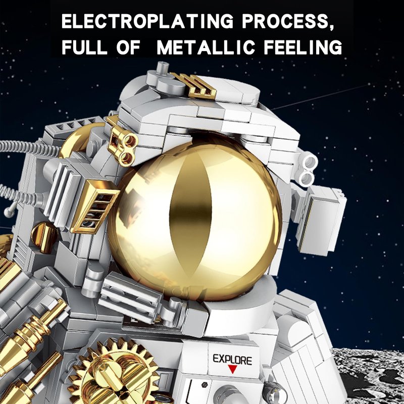 - Cyborg Astronaut Space Set: The space astronaut creative toy adopts a semi-perspective structure design; the shiny gold, white and gray match, presenting a cool half-human and half-mecha shape. The joints are movable, equipped with a plated helmet and a detachable base, which will surely take imagination to new heights