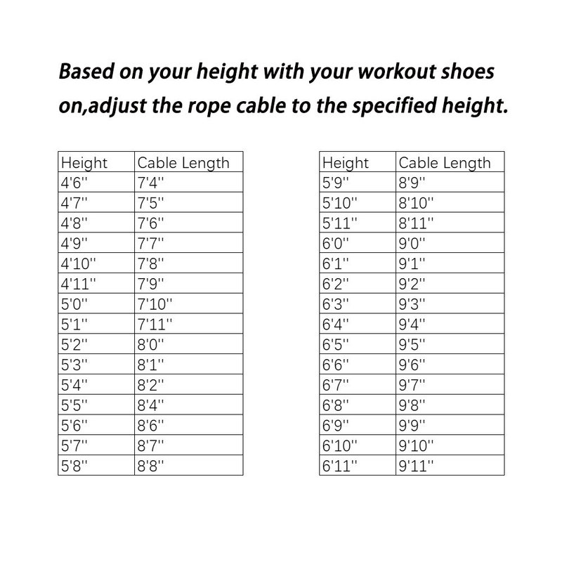 Since the maximum adjustable length of the skipping rope is 14 inches,the large size(10 feet) suitable for people over 5'9'' and the small size(8.85 feet) suitable for people under 5'9''.
