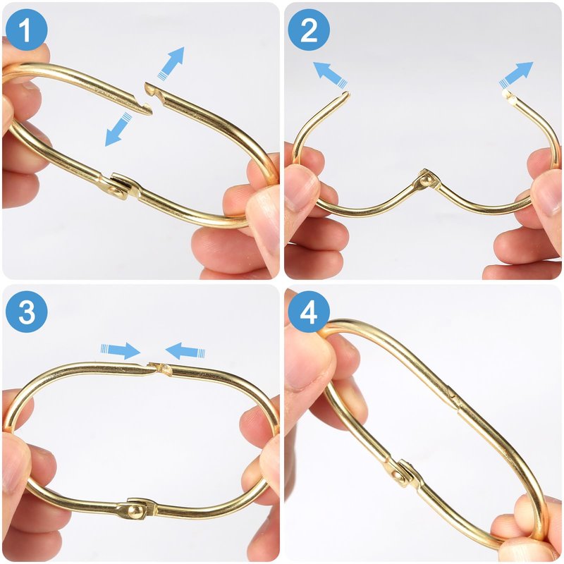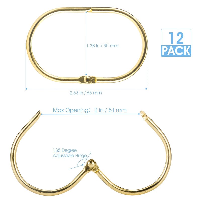 - [WIDE APPLICATION]: The simple, attractive and snap-on design gives the gold shower curtain rings many possibilities, not only for shower curtains, but also for curtains, DIY loose-leaf, organizing tools, key rings, scrapbooks and more.