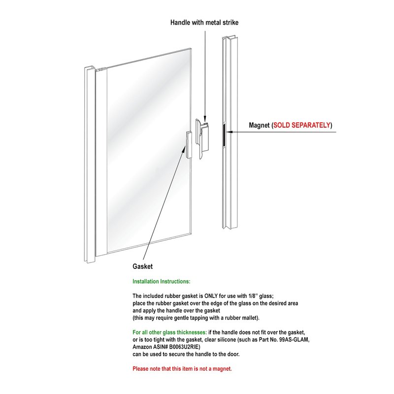 For Retrofit or New Installation No Glass Fabrication Required 3" Frameless Shower Door Handle with Metal Strike fits glass thickness: 1/8", 5/32", 3/16", and 1/4" . Shower Door Handle includes vinyl stainless steel strike insert. Color: Bright Gold Handle Size: 3 in. Installation Instructions: The included (black) rubber gasket is ONLY for use with 1/8” glass; place the rubber gasket over the edge of the glass on the desired area and apply the handle over the gasket (this may require gentle tapping with a rubber mallet). For all other glass thicknesses: if the handle does not fit over the gasket, or is too tight with the gasket, clear silicone (such as Part No. 99AS-GLAM) can be used to secure the handle to the door. Please note that this product is not a magnet.