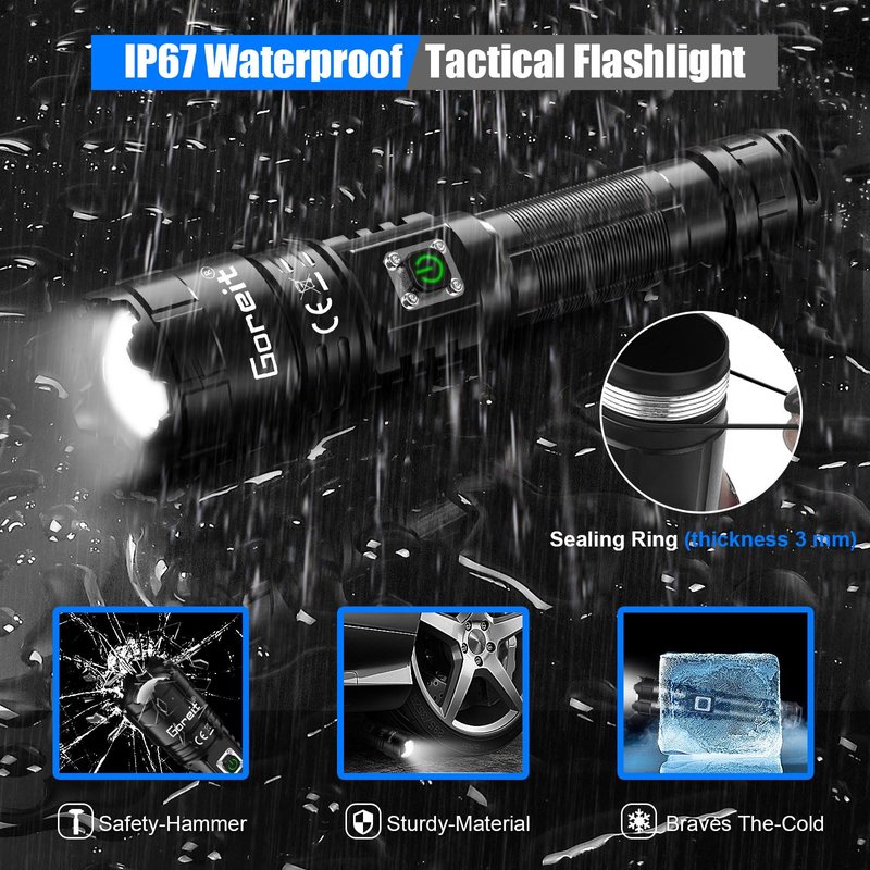 - 【IP67 WATERPROOF & PRACTICALLY INDESTRUCTIBLE】Goreit G9322 handheld flashlight is made of aerospace grade aluminum alloy and build for rough handling. This IP67 waterproof high powered flashlight can survive a 10-foot drop or being temporarily submerged under water. This powerful flashlight can even be frozen or run over by a truck and it still works! It is very suitable for use in rain, snow, or emergency situations.