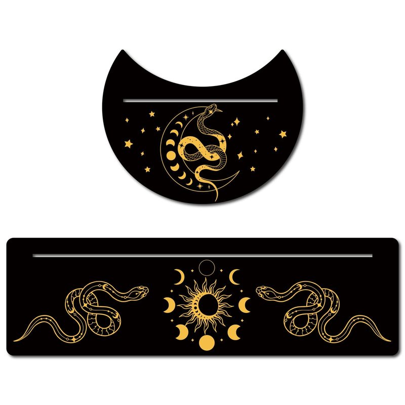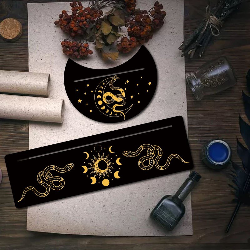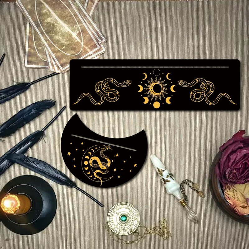 GORGECRAFT 2 Pieces Wooden Tarot Card Stand Black Tarot Card Holder 5" Moon Shape and 10" Rectangle Wood Tarot Cards Altar Stand Display Holder Witch Divination Ceremonial Tools, Moon Phase and Snake Product Specification: Material: Wood Color: Black Size: Rectangle: about 130x100x5mm Moon-shaped: about 254x76.2x5mm Package Included: 2pcs tarot card holder Feature: [LASER ENGRAVING] - The Tarot card holder is made of high-quality natural wood, laser cut and carved patterns, the patterns are clear and complete, and the cut surface is smooth. Each piece you get is unique and meaningful. [WIDE APPLICATION] - Wooden tarot decks can be used to decorate altars and ceremonial tables. They are a great tool to assist you in divination and meditation. They can be used in any space to display your daily or weekly cards. [EASY TO USE] - The thickness of each card slot is 5mm, which can easily stand the tarot card, hide the front and back, release your hands, give you energy, and give you more enlightenment. [BEST GIFT] - This wooden tarot card stands are suitable as Christmas, New Year, and birthday gifts for your family, relatives, friends and yourself who love divination, meditation, assisting you in completing magic rituals and exploring magic journeys.