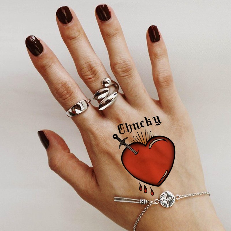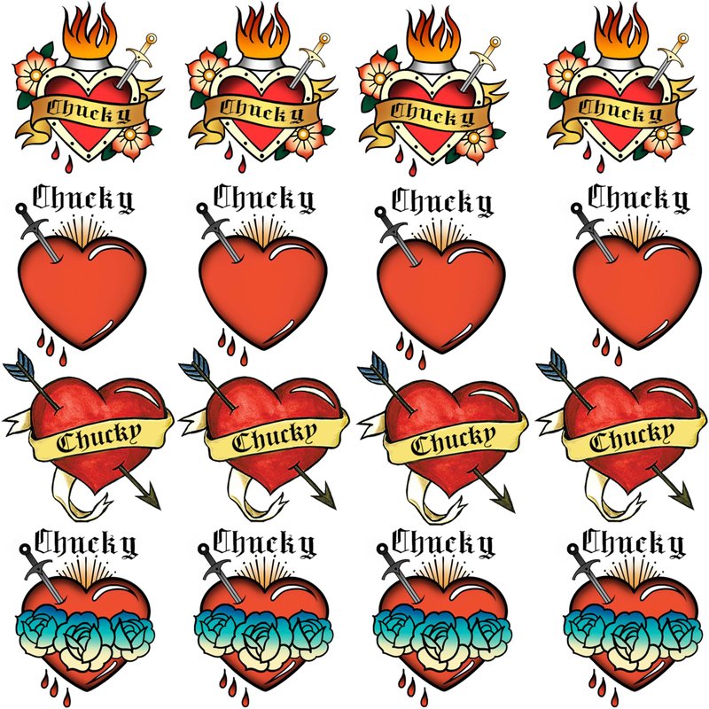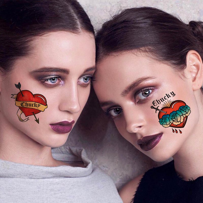 - π[Safty And Easy Applied Chucky Heart Tattoos For Adults] This Is A Good Choice To Make You Feel Realistic And Painless Tattoos. Our Disposable Temporary Tattoos Stickers Made Of Safe Non-Toxic Ink. When You Want To Use It, You Need To Tear Off The Surface Of The Film, Then Completely Soak It With Water, Turn It Over And Cover It On The skin And Wait For 10-20 Seconds. When You Remove The Sticker, You Will Find Realistic Tattoos Appear On Your Skin.