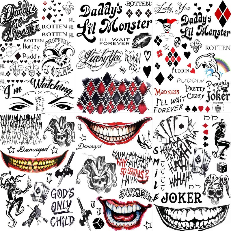 - π[6 Sheets Long Lasting Joker Tattoos Temporary] There are 6 Sheets Large HQ Temporary Tattoos For Women Men Teens Adults Kids Boys Girls Children Women Adults Decals, You Can See Halloween Makeup Damaged Joker Temporary Tattoos Prison Ghost Rapper Prisoner Smile Face Clown Tatoos Inmate Costume Scary Halloween Temporary Tattoos Party Accessories.