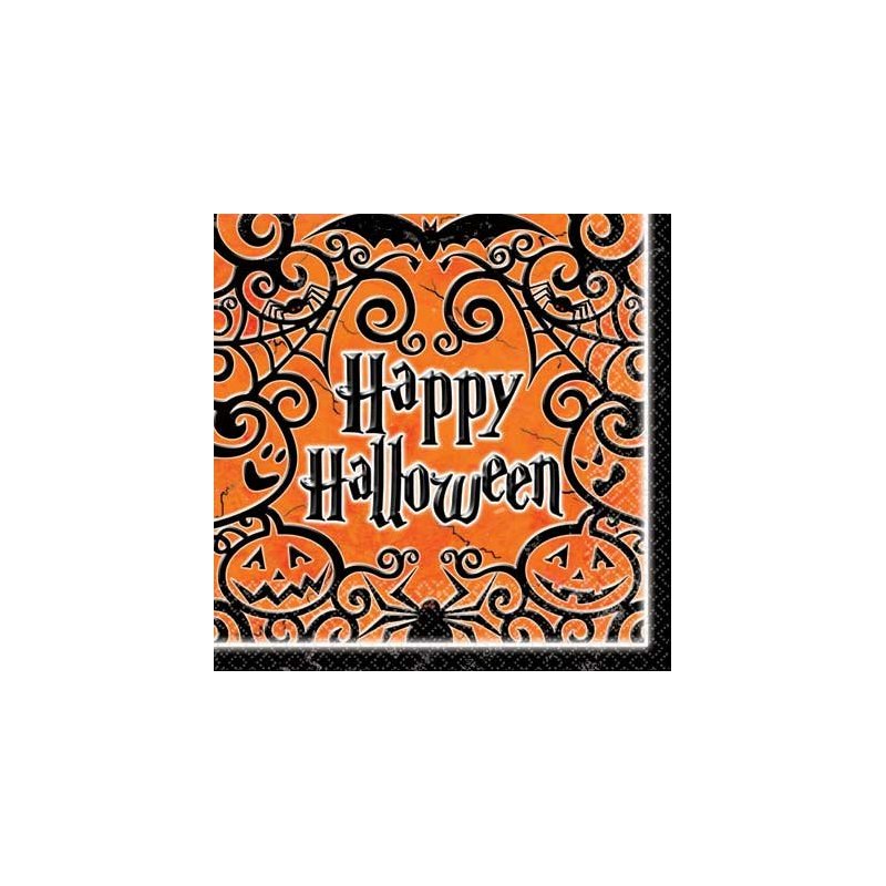 Add some Halloween fun to your party with our Gothic Greetings Beverage Napkins! These napkins feature images of smiling pumpkins and creepy cobwebs against a bright orange background, as well as a festive message of "Happy Halloween." Napkins measure 5" x 5" when folded. 125 2-ply napkins per package.