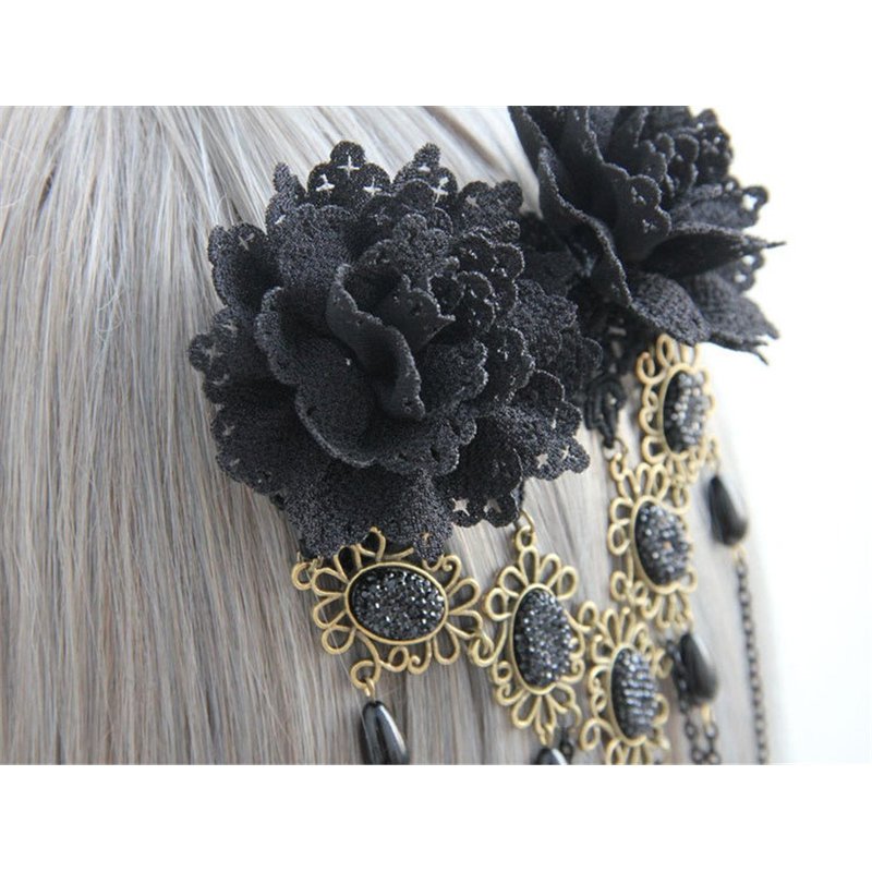 Gothic Vintage Black Lace Rose Flower Hair Clip With Pearl Chain Tassels Hair Barrettes for Women Princess Headwear
