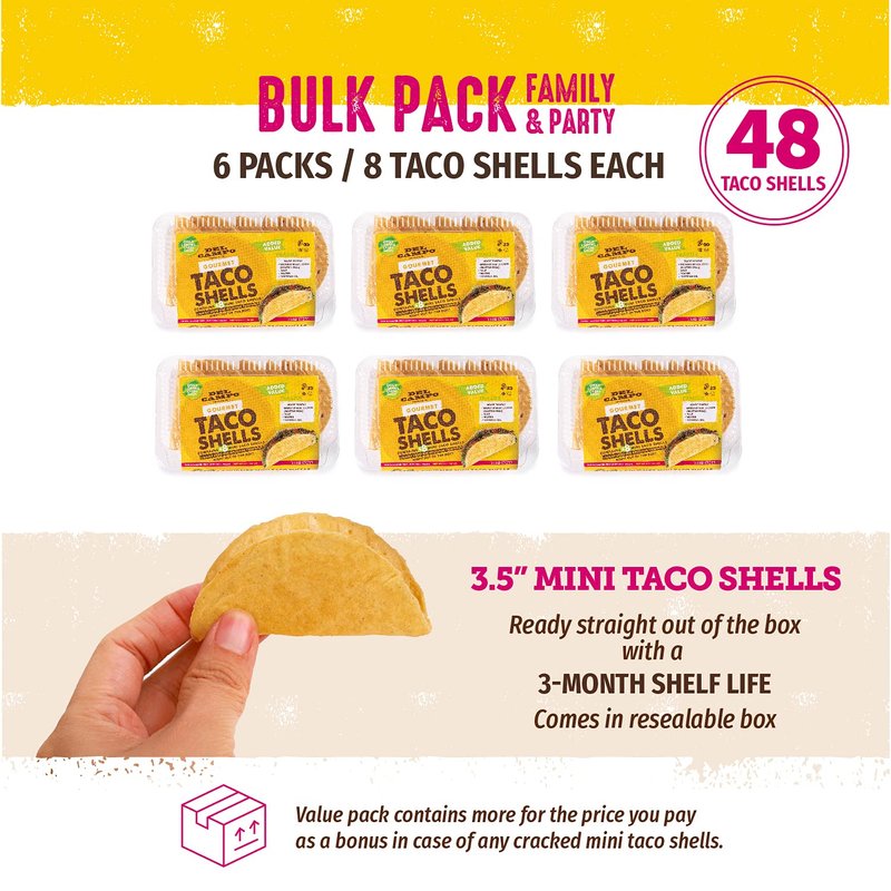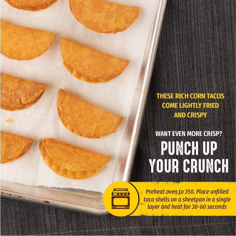 ARE YOU LOOKING FOR A TACO SHELL THAT TASTES FRESH AMD DOESN'T CRUMBLE ? Rich corn flavor , lightly fried and crisp. Authentic Mexican Restaurant. Impress and delight your guests and family.These mini tacos fit right in your hand , a delicious 2-bite appetizer when filled with shredded beef , chicken , or fish, etc.Ready to fill , serve, and eat right out of the box! Option to reheat briefly in medium heat oven before or after filling. Gluten free , made in a dedicated Gluten Free Facility. sTRICTLY Kosher and parve. OU and CRC Supervison. Vegan. 3 month shelf life when sealed and stored in cool, dry location. Can be frozen.