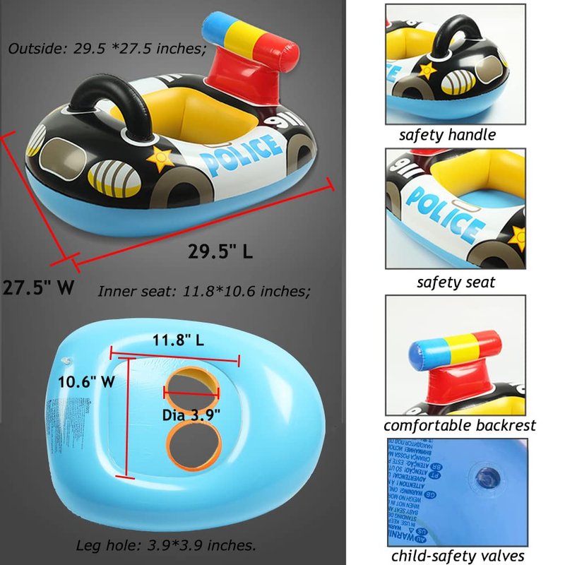 - 🚔BABY SAFETY DESIGN: This is a baby pool float design for baby toddler kids aged 6-36 months and weight under 38 lb. Police car baby pool floatie is designed for kids who not good at swimming. The flat inflatable seat design increased comfort, safety handle and comfortable backrest good to keep balance, enhance security. Smooth leg holes for baby to free swinging and no worryless enjoy water fun.