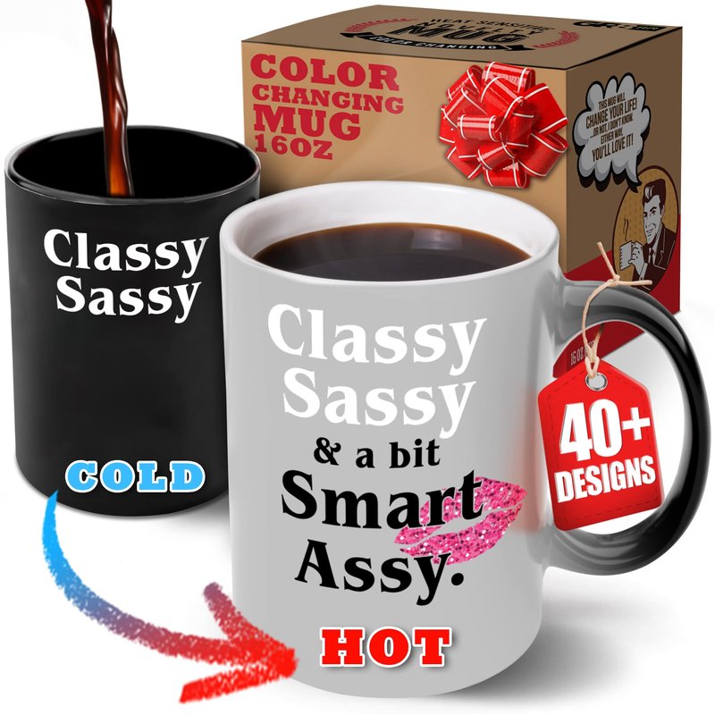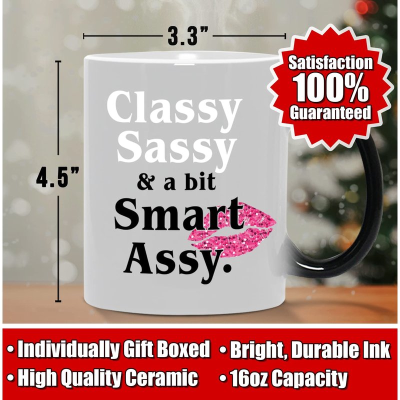 GR8AM Text Revealing Tea Cup 16oz - Classy Sassy & A Bit Smart Assy - Funny Coffee Mug & Cute Coffee Cups for Women. Best Big Coffee Cups for Stocking Stuffers or Cute Gifts for Women