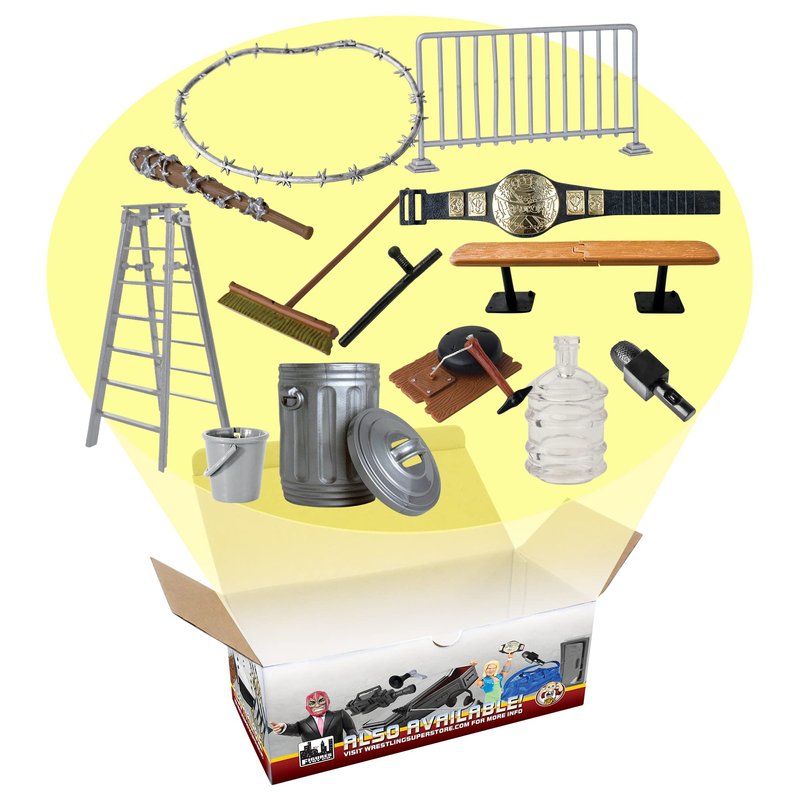 - This set includes a Hardcore Figure Belt along with a range of brutal accessories: a Trash Can, Bucket, Ladder, Broom, Baton, Breakable Bench, Microphone, Water Jug, Barbed Wire, Guardrail, Timekeeper Bell, and a Barbed Wire Bat.