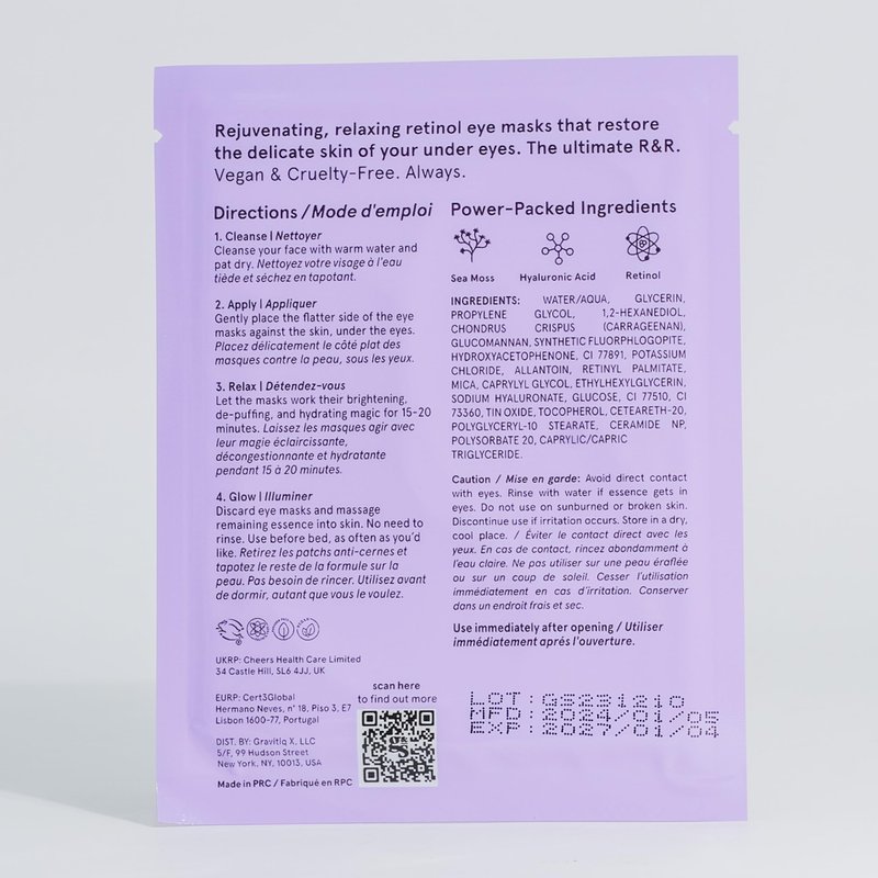 - The Ultimate R&R - Eye-bright, overnight with our retinol under eye mask. Packed with magical retinol, known to reduce appearance of fine lines and plump the skin, these anti aging eye patches revitalize tired eyes and restore luminance to your complexion.