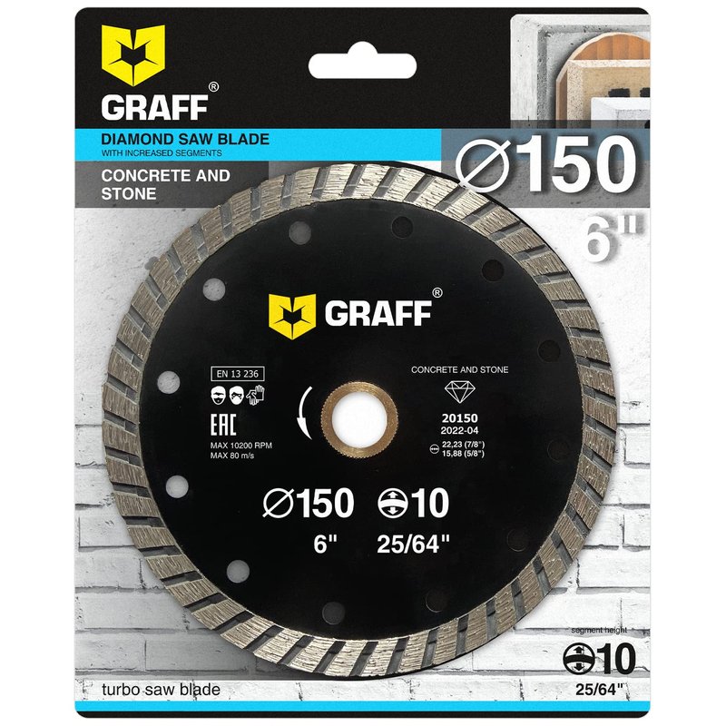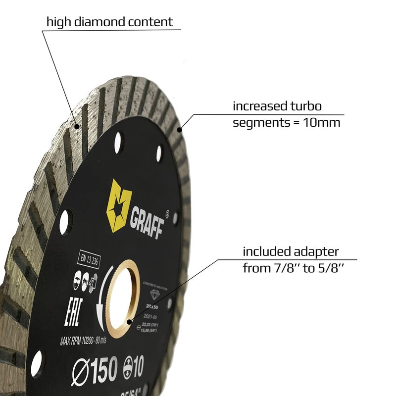 - UNIVERSAL: Diamond blade for angle grinder is designed for domestic use and DIY. GRAFF turbo cutting disc is intended for working with concrete, artificial stone, paving flag and kerb.