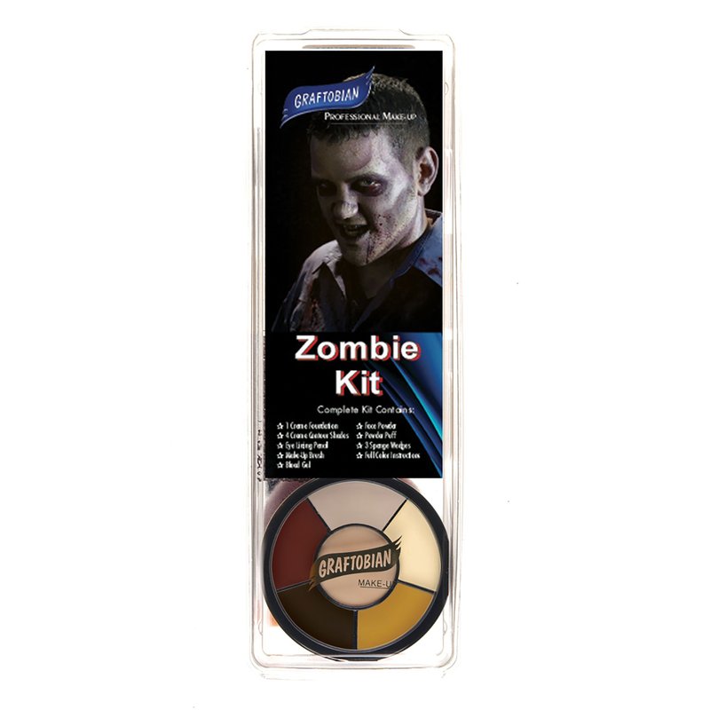 • Kit Also Contains: Face powder and puff to powder over and set the makeup so it will not smear or rub off, Sponge wedges for makeup application, 1 Lining & detailing brush, Blood gel, 3 shades of Zombie Gutz.
