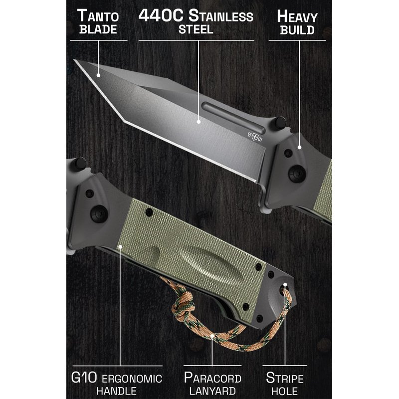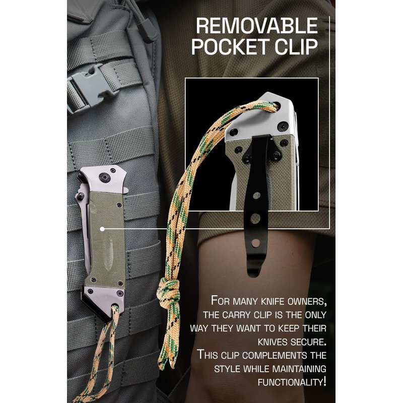 - Pocket Knife for Men has a tanto blade that is made of strong and durable 440 stainless steel and coated with TI-NI. Handle material is G10 and metal. Pocket clip is available (it is removable for your comfort). Equipped with the thumb studs for right and left hand use and a lanyard hole.