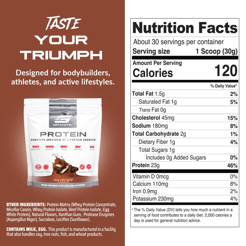 Granite Protein Powder | Whey Isolate & Concentrate| Casein for Lean Muscle Building & Workout Recovery | 30 Servings | Egg & Grass Fed Protein | 23g Protein from 5 Sources | Chocolate Flavor