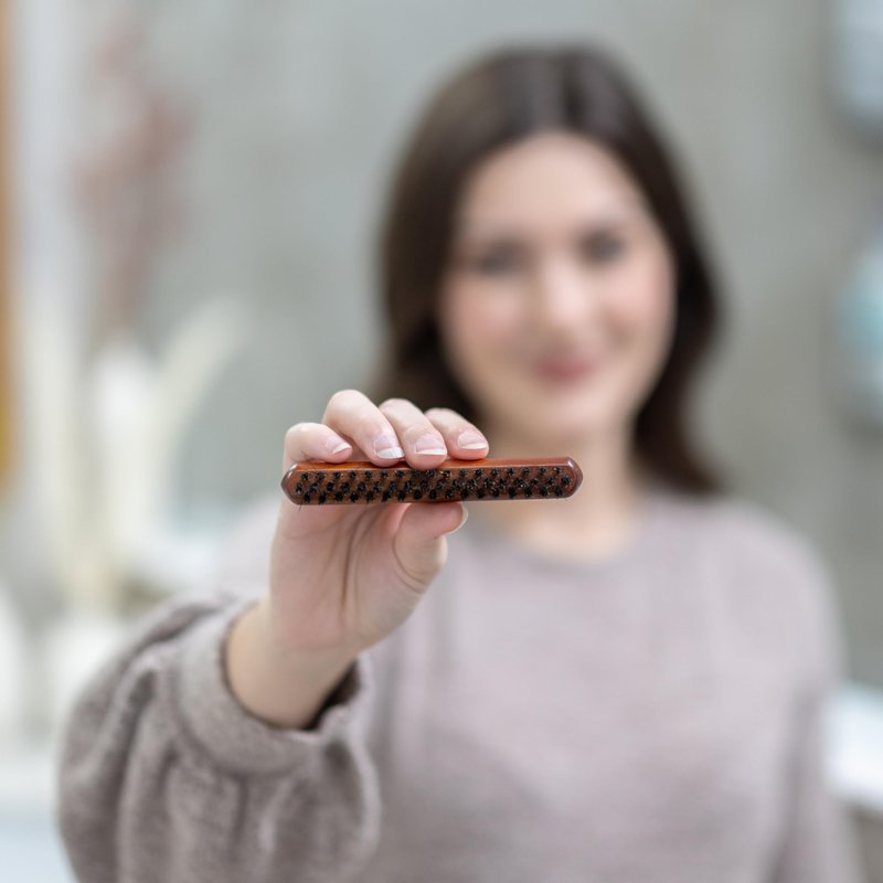 Dive into the realm of impeccable hairstyling with a brush that might be small in size but packs a massive punch in capability. The boar bristle teasing brush, with its compact nature, ensures that you never have to compromise on style, no matter where your adventures lead you. Truly, it's the embodiment of 'small but mighty'. Ever found yourself wanting to pull off that impeccable slicked-back look, be it an elegant ponytail or a chic bun? The brush's densely-packed bristles become your best friend, helping you sculpt with precision and ease. Just a few strokes and voilà, you're runway-ready! Volume and texture? Oh, it’s got you covered. Dive into the world of mesmerizing hair heights and depths, as this wonder tool paves the way for enviable backcombing and teasing. Bask in the joy of hair that not only looks fuller but feels luxuriously voluminous. But what sets it apart is its precision prowess. Those tricky edges, rebellious baby hairs, and unpredictable flyaways? Consider them tamed. The brush acts as your personal edge whisperer, lending a touch of finesse and delivering a sophisticated finish to every look. However, the true essence of this brush lies in its ability to enhance your hair's intrinsic glow. Thanks to the renowned boar bristles, each brushing session becomes a spa treatment for your tresses. Experience the magic of evenly distributed natural oils that not only keeps your hair healthy but also crowns it with a captivating, natural sheen. In the vast ocean of hair tools, this brush emerges as a beacon, offering style, health, and convenience, all bundled into its petite frame. It’s not just another hairbrush; it’s a statement, an experience, and a promise of unyielding perfection. Give your hair the royal treatment it deserves!