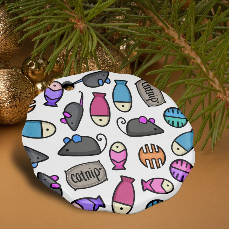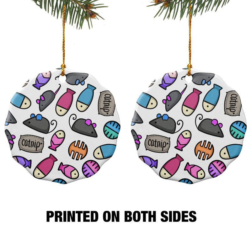 GRAPHICS & MORE Cat Toys Mouse Fish Catnip Pattern Porcelain Scalloped Holiday Christmas Tree Ornament - 2.8" (7.1 cm)