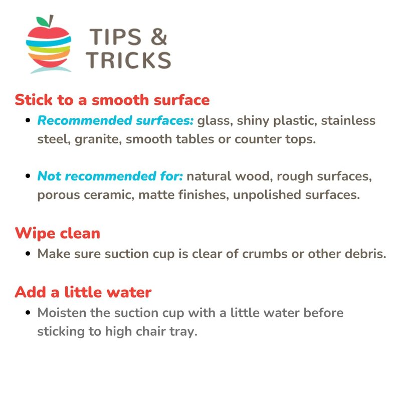 - STRONG SUCTION 🍏 This apple shaped suction toy holder suctions strongly to most smooth surfaces (high chairs, strollers, activity centers). For best suction, make sure the suction cup is clean and moisten the suction cup with a baby wipe or a few drops of water before suctioning it to the table. Please note, the surface you are sticking Grapple to cannot have a texture, grain or any imperfections that will keep the suction cup from sealing. Grapple does not work on the Stokke high chair tray.