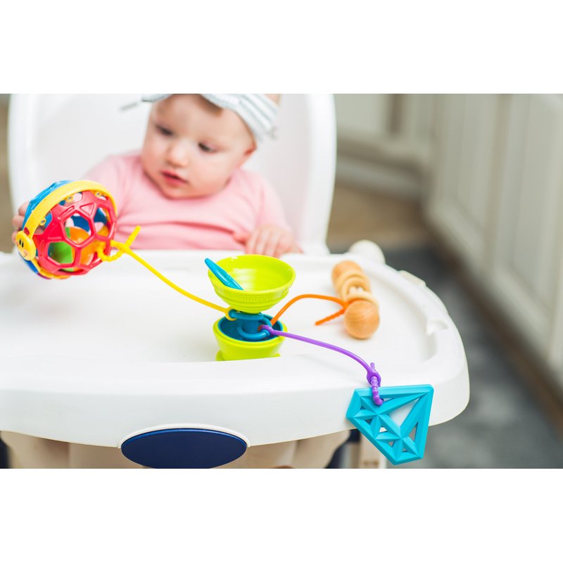 - STOP THE PICK-UP GAME 🍏Tired of picking up toys that have been dropped or thrown to the ground? Grapple suctions right to your baby’s high chair tray or any flat, smooth surface and holds three of baby’s favorite toys. The suction cup base and adjustable tethers keep toys within reach of baby and from falling to the floor.