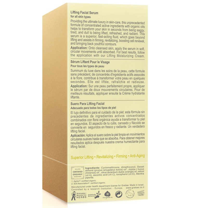 - LIFTING COLLECTION: GRATIAE LIFTING FACIAL SERUM is an advanced daily use skincare. This silky, smooth anti-aging serum for face is made with organic jojoba oil, organic sweet almond oil, rose hips oil, vitamin C, vitamin E oil and retinol, helping to treat fine lines and wrinkles for s smoother brightened more unified skin appearance. This lifting vitamin C serum is perfect for all skin types, especially sensitive, dry, and allergy-prone skin.