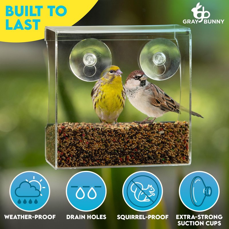 - DURABLE YET LIGHTWEIGHT: Crafted with a thick acrylic frame with large viewing window so that you can examine beautiful songbirds in vivid detail. This clear bird feeder is both sturdy and lightweight, ensuring long-lasting performance. Attach to a high window sill on your home to prevent squirrels from reaching it.